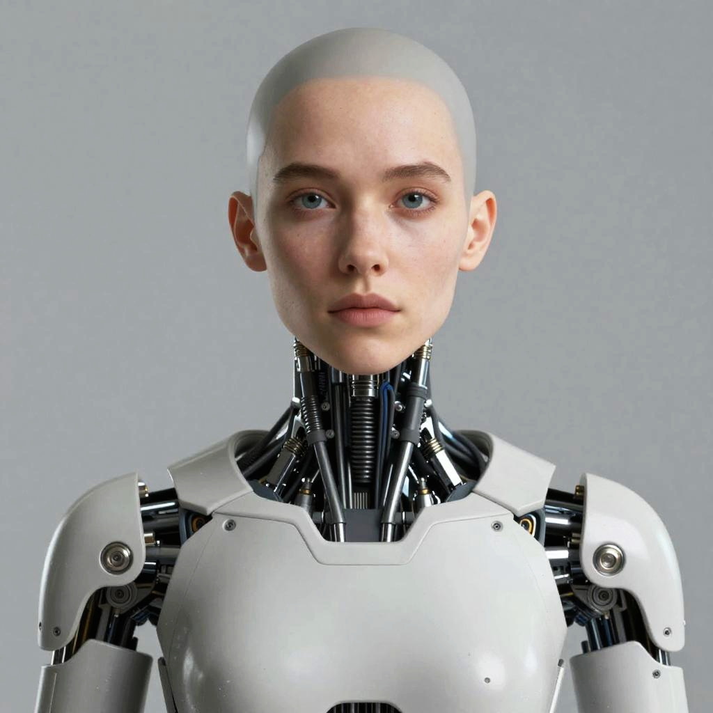 (detailed face), (photorealistic), (masterpiece), (photography), (realistic skin texture), alluring womansexy 1girl, ginger, paddock girl, looking at viewer, (cleavage), (front view), cyborg, android, blurry background, techno-witch