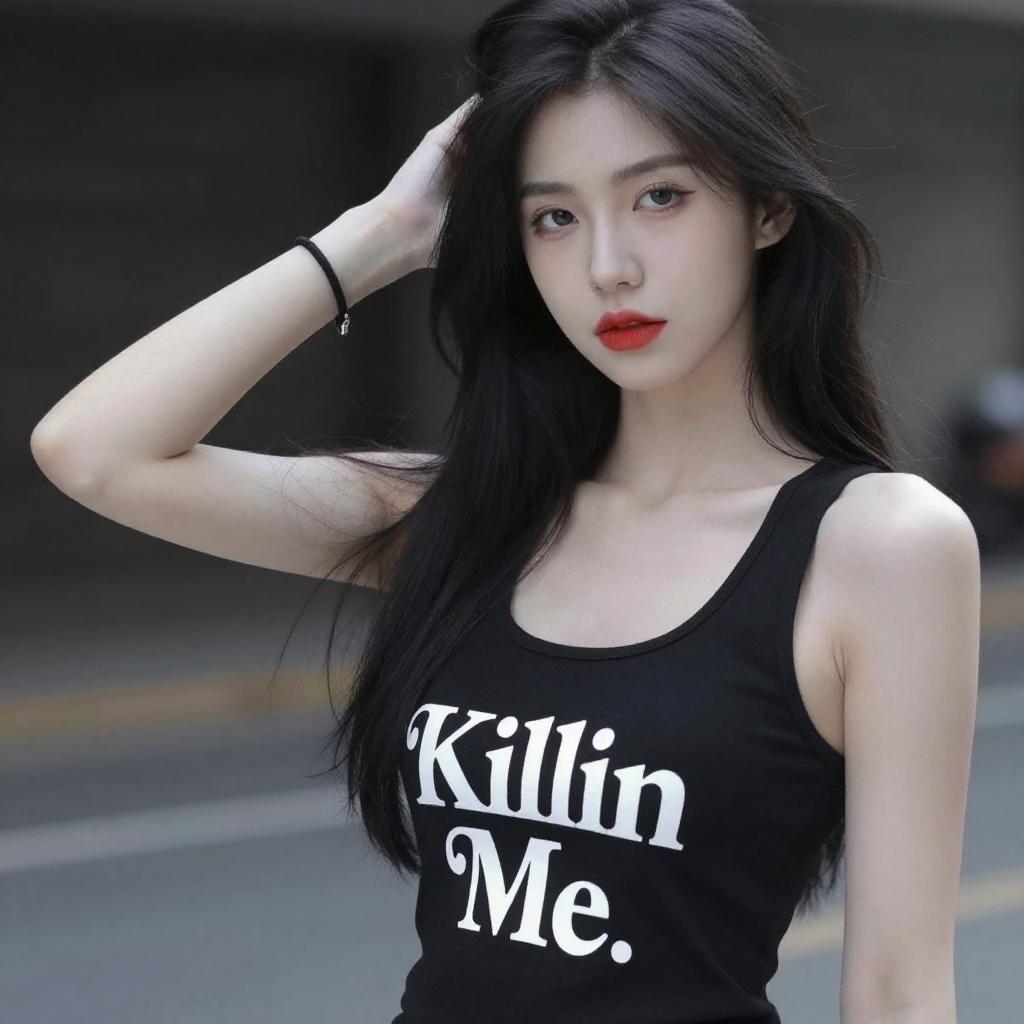 Photograph of a pale-skinned woman with long black hair, wearing a black tank top with a white graphic and "Killin' Me" , red lipstick, and a black bracelet. She poses with one hand in her hair, standing against a blurred dark background.