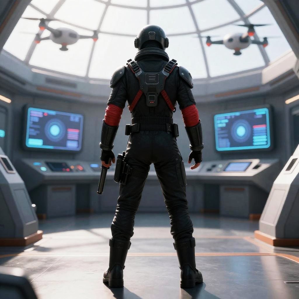 A person in a black and red futuristic spacesuit stands with back to the viewer, holding a gun. They are in a high-tech, dome-shaped control room with glowing screens and geometric shapes. Sunlight filters through the dome, illuminating the room. Two drones hover in the background. The person's suit has visible armor plating and their head is covered by a helmet with a visor.