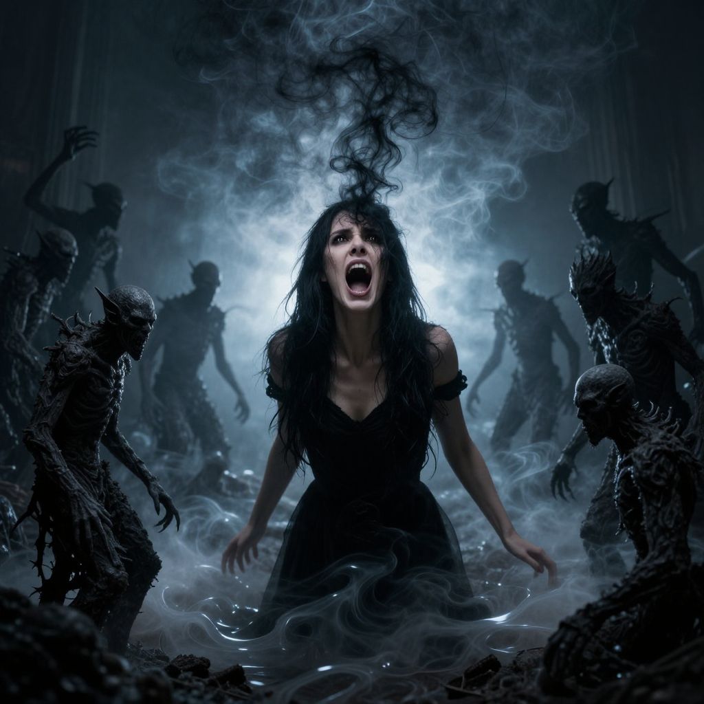 Eerie, horror, Surreal, fantasy, magic realislm, (Fight my inner demons), a woman screams, there is black smoke around her head, ((demons created out smoke):1.5) smoke texture, anamorphic demons made out of smoke, smoke sculptures, ((by Vasily Vereshchagin)), liquid gas effect, dark fantasy, luminescence, ultra realistic, hyper detailed, soft lighting, backlit, chaotic background, by Alberto Seveso, by Albert Watson, by Andre Kohn