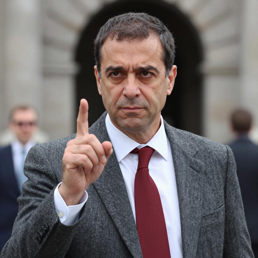A middle-aged man with dark hair, brown eyes, and a serious expression. He wears a gray tweed suit, white shirt, and red tie. His right hand is raised, index finger pointing upwards. Background shows a stone building with an archway. Two blurred figures are in the background. Man's skin is fair.