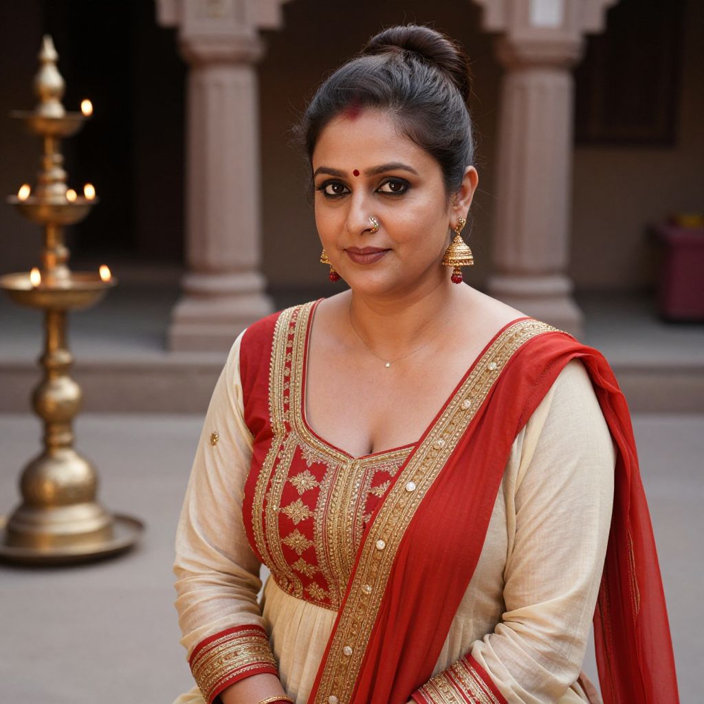 A well-lit, naturalistic shot of a middle-aged Indian woman with a elegant bun Indian hairstyle, wearing a classic Bollywood-style costume with red borders and gold detailing, sitting in a traditional courtyard in Varanasi, the backdrop features oil lamps and ancient pillars, her face is serene with deep-set eyes and a gentle, maternal expression.. The woman has big tits and cute face