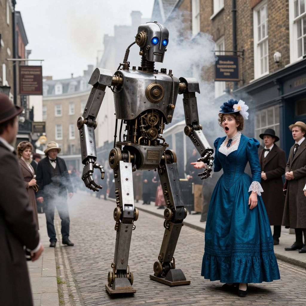 Photograph of a steampunk street scene: a metallic robot with blue glowing eyes and smoke emanating from its joints walks down a cobblestone street. Beside it, a shocked Victorian woman in a blue dress and white bonnet points at the robot. Background includes people in period clothing, brick buildings, and shop signs. The scene blends historical and futuristic elements, creating a surreal, vibrant contrast. The cobblestone street and Victorian attire add texture and depth to the image.