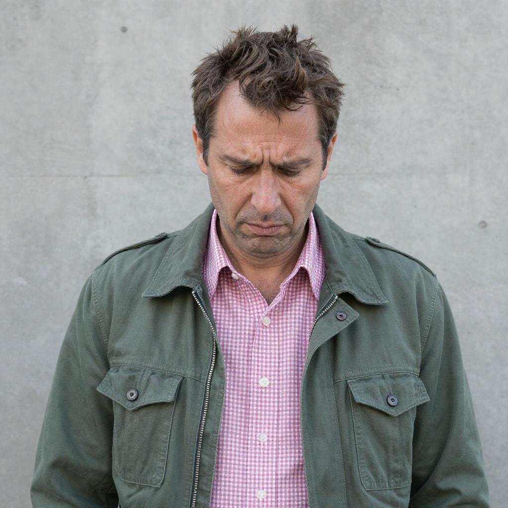 Photograph of a middle-aged man with short, brown, wavy hair and a slightly anxious expression. He wears a green jacket over a pink checkered shirt. Concrete wall background. Man looks downward. Casual, rugged clothing. Upper body shot.