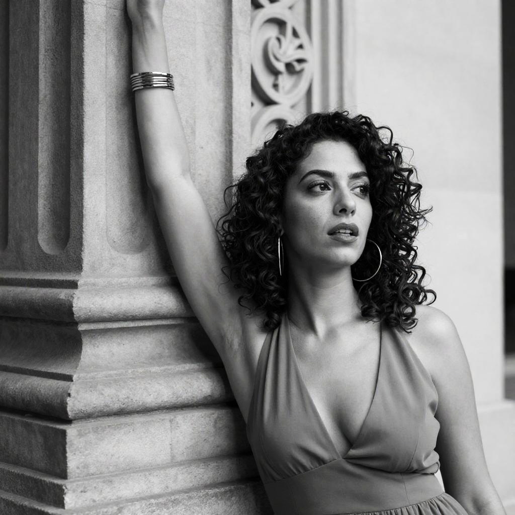 Black-and-white photograph of a woman with dark, curly hair, wearing a low-cut, buttoned dress and large earrings. She leans against a wooden door, arm raised, looking directly at the camera. Background includes foliage and a ured wall.