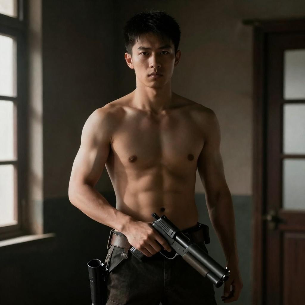 Muscular, shirtless man with messy brown hair and intense expression, holding a katana in a rain-soaked, futuristic cityscape. Tall skyscrapers with neon lights and debris-filled streets in the background. Man's right arm extended forward, left fist clenched. Rain streaks across the image.