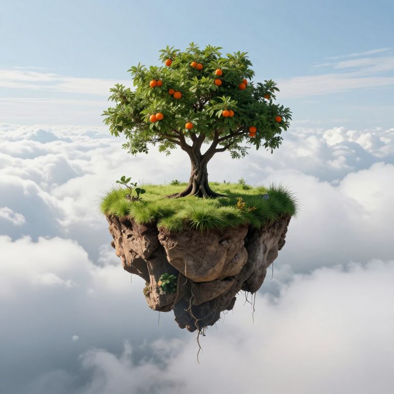 Suspended high above the vast expanse of fluffy white clouds, a solitary tree with lush green foliage and vibrant orange fruits thrives atop a floating island of grass and soil, its roots dangling precariously into the void below.