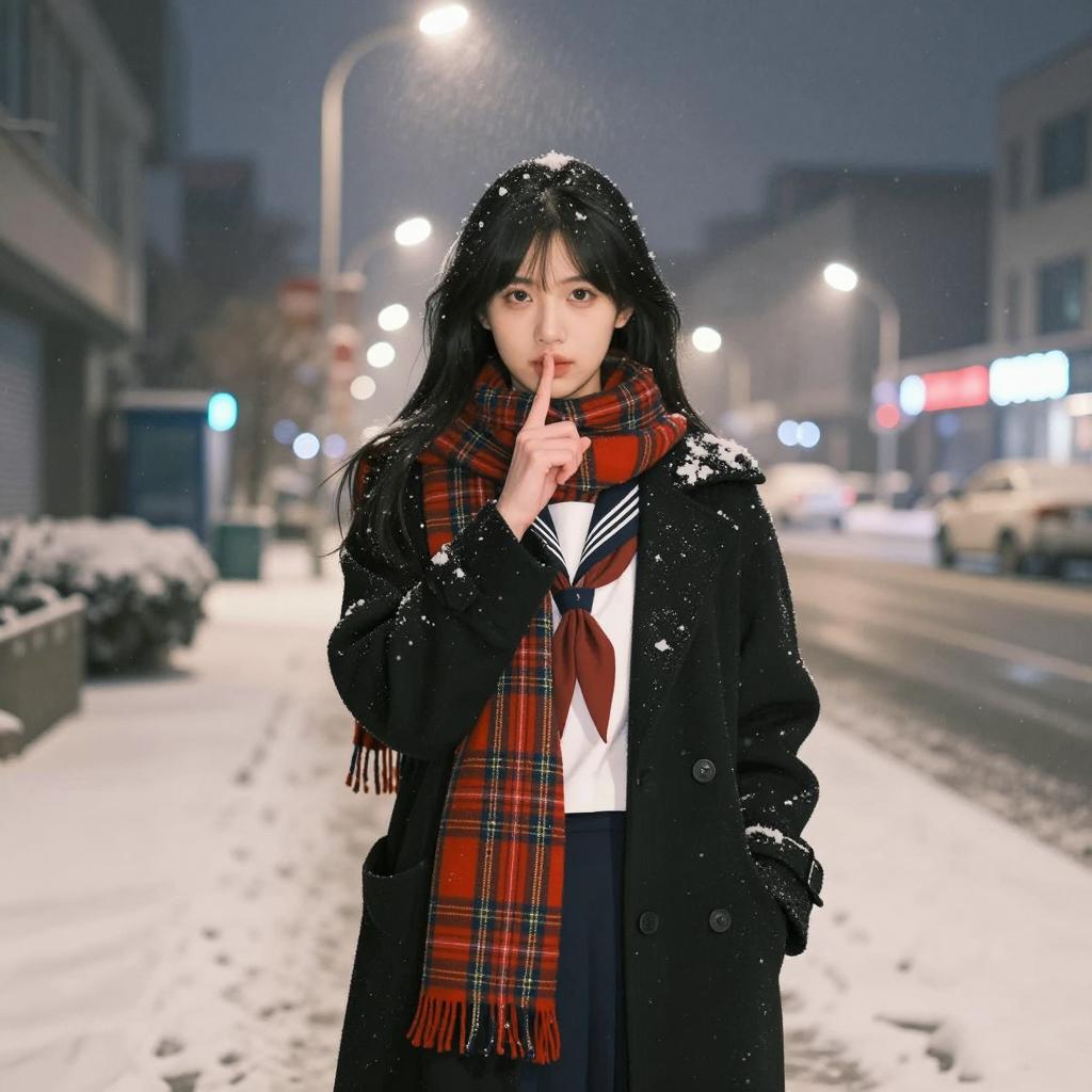 Asian woman with long black hair, wearing a black coat, red and plaid scarf, white sailor top, and blue skirt, standing on a snowy urban street at night. She has her finger to her lips, looking directly at the camera. Snow is falling, streetlights and blurred city lights in the background. Snow-covered ground. She is the central figure, positioned slightly to the left, with a serious expression.