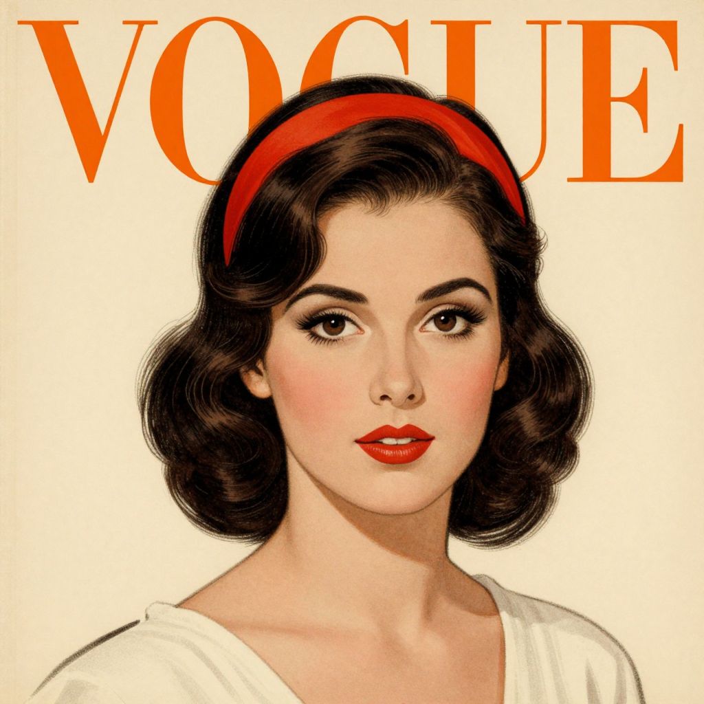 A vintage illustration-style cover of *Vogue* magazine featuring a woman with dark, wavy hair adorned with a red headband, set against a classic beige background with bold orange and black typography, evoking a retro aesthetic reminiscent of early 20th-century fashion illustrations.