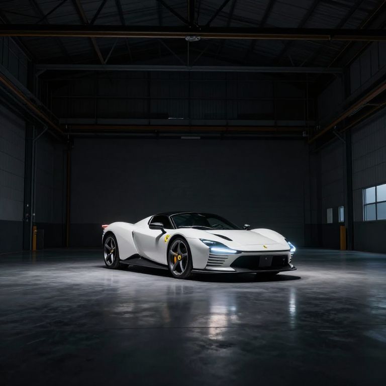 Wide-Angle Visual Impact a Ferrari SP3 parked in the middle of a dark empty warehouse with a volumetric atmosphere and cinematic lighting with professional color grading and an orton effect glow,