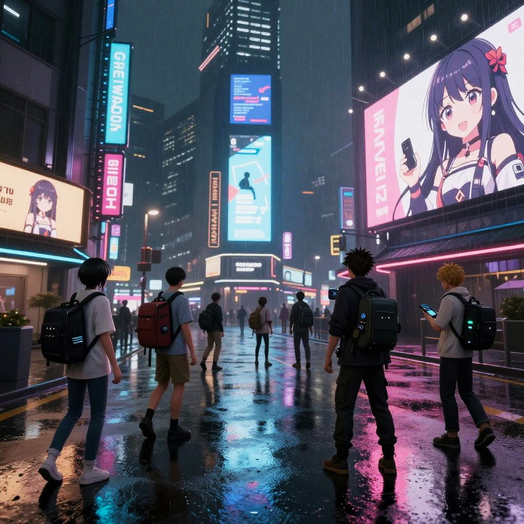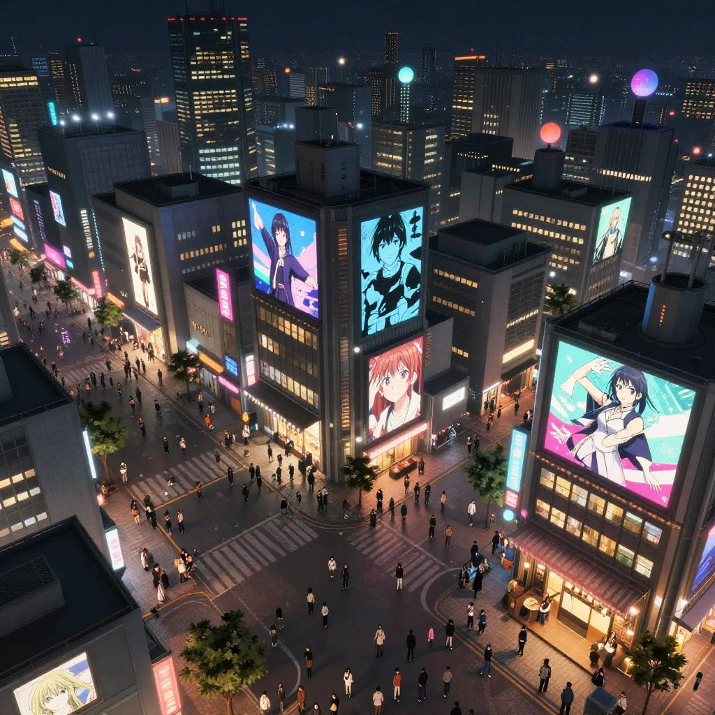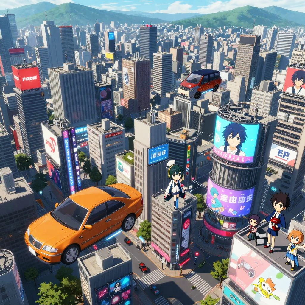 Anime city online featuring a sprawling metropolis with flying cars, glowing billboards, diverse anime-styled citizens, blending traditional Japanese elements with advanced technology