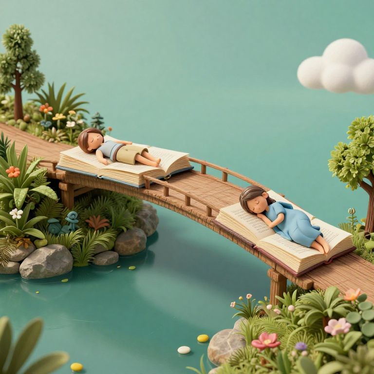 A bridge of books connects two dreamers mid-nap, turning every page into shifting landscapes as they sleepwalk through literature.