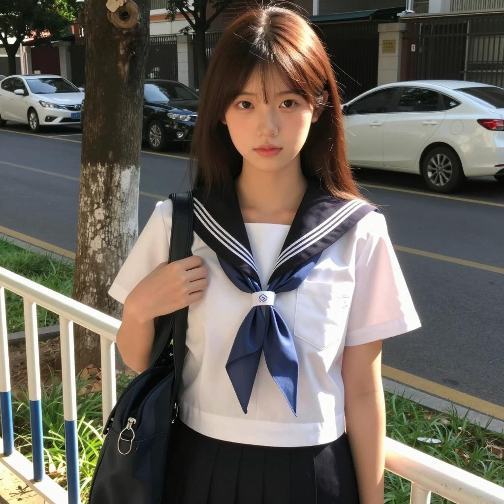 Asian woman with straight brown hair, wearing a white sailor-style school uniform with a blue neckerchief and black skirt, stands outdoors near a tree. She holds a black bag over her right shoulder with her left hand on a white railing. Sunlight illuminates her face, which has a neutral expression. Background includes a street with parked cars and grass. Daytime setting.