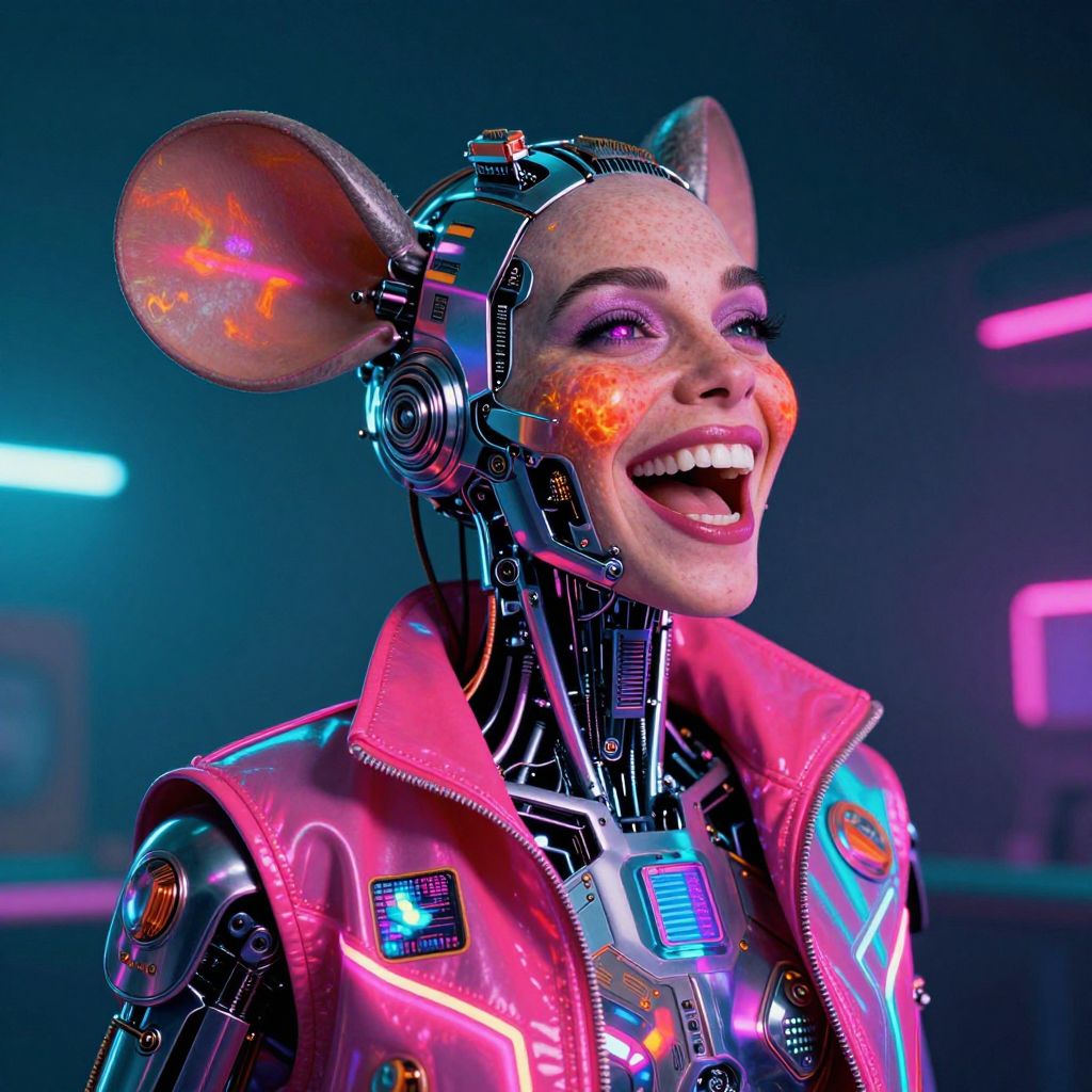 A hyper-detailed M100-style analog photo of a laughing antromorphic Mouse cyborg in the style of ck-ncr, blending intricate cyberpunk robotics with vibrant, human joy, Her radiant smile highlights the duality of her being: half of her face is organic, glowing with fiery freckles and warm, soft skin, while the other half reveals an intricate network of exposed wiring, microprocessors, and metallic plating, These robotic elements glisten with delicate servos and fluidly moving panels, emphasizing her futuristic elegance, Her mechanical eye, softly glowing and alive with laughter, reflects her joy, seamlessly integrated into the interplay of metal and flesh, She wears a bold, sleeveless cyberpunk jacket adorned with holographic patches and glowing lines, contrasting with her high-tech enhancements and emphasizing her dynamic personality, The jacket's vivid neon hues—pink, cyan, and electric purple—pulse gently, mirroring the energy of her expression, The interplay of her laughter, illuminated by atmospheric lighting, creates a stunning cinematic effect: volumetric neon lights cast rippling magenta and blue hues across her metallic and organic features, blending harmoniously with the hazy, hyperpunk-inspired backdrop of dark turquoise tones