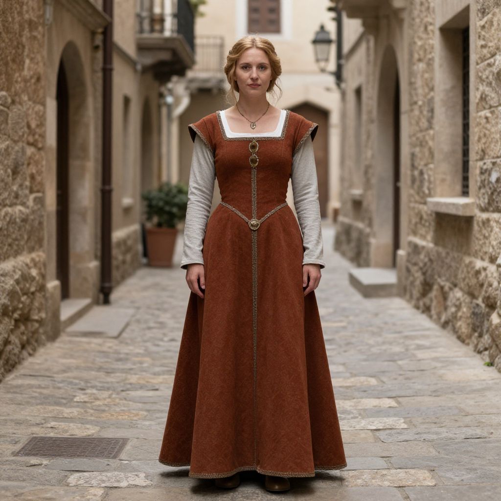 Photograph of a blonde woman in a medieval-style brown velvet dress with white sleeves, standing in a cobblestone European alleyway.