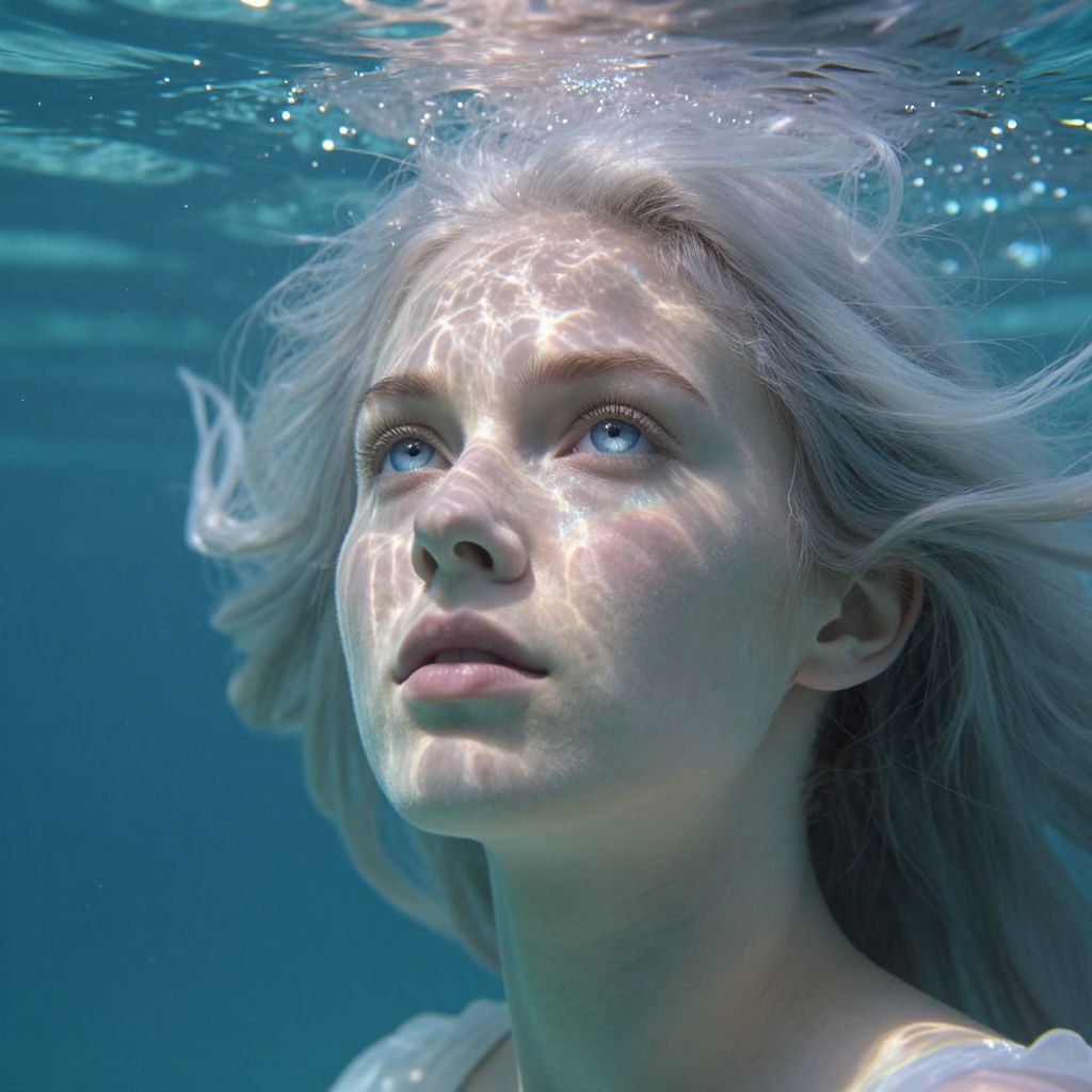 Craft a photorealistic portrait capturing the essence of a Slavic woman with icy blue eyes and silvery-white hair, her tresses dancing in the breeze. Viewed from an unusual underwater angle looking upwards towards her ethereal visage, the scene is illuminated by shimmering sunlight filtering through the surface, casting iridescent rays upon her porcelain skin and accentuating the delicate texture of her timeless features. Her enigmatic gaze exudes a sense of wonder and mystery, drawing viewers into the untold tales hidden within her soulful expression while reflecting an emotional spectrum from tranquility to intrigue. This masterfully composed portrait seamlessly merges water and human spirit, evoking an atmospheric ambiance that resonates with serenity and enchantment.