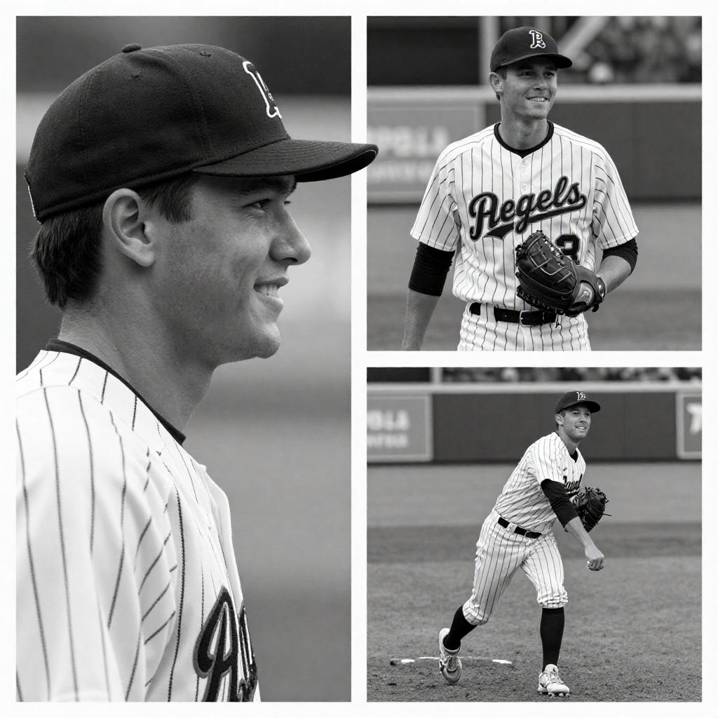 Black-and-white photograph collage of a smiling baseball player in a pinstriped uniform and cap, shown in three different poses: close-up profile, standing with a teammate, and mid-pitch on a baseball field. The player's cap has a visible . The background includes a blurred stadium and advertising signs.
