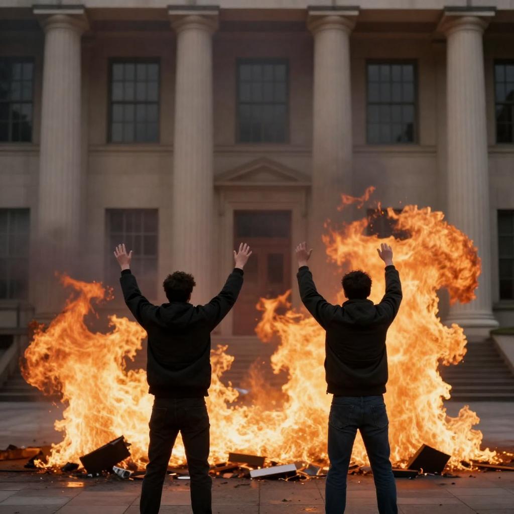 Photograph of a nighttime street scene with three people in motion, surrounded by bright orange flames and dark smoke. They are in front of tall, illuminated stone columns and a black iron fence. The ground is scattered with white debris. The people wear casual clothing, with one person in a brown jacket and another in a white shirt.