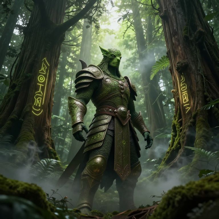 Spedo as a mystical forest guardian, standing amidst ancient towering trees with glowing runes, soft rays of sunlight filtering through dense foliage, ethereal mist swirling around, vibrant green and earthy tones, detailed textures on spedo's armor