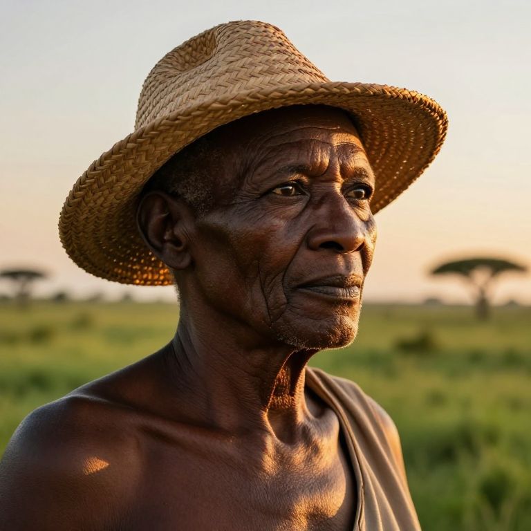 Envision a photorealistic portrait of an African elder, their wisdom reflected in weathered skin and soulful eyes, gazing pensively towards the horizon beneath a woven straw hat. The setting sun's soft golden light bathes the scene, casting long shadows across their lined face while illuminating the intricate details of their smooth, mahogany complexion. Surrounded by an endless expanse of lush green savannah, this portrait evokes emotions ranging from introspection to resilience as his expression hints at memories deeply etched in time. His soulful gaze invites viewers to delve into a world of untold stories hidden within ancient eyes.