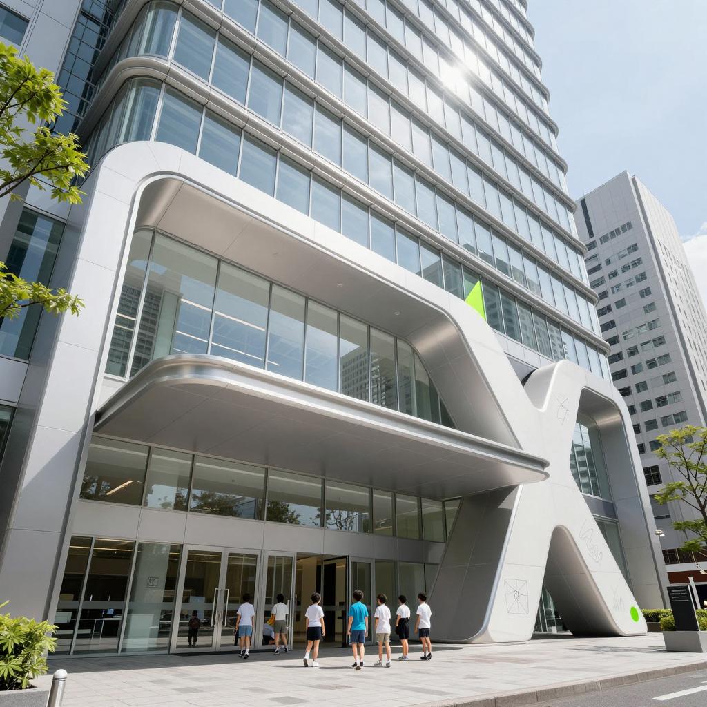 Kindergartener Drawing Building exterior editorial photos, Eye-level, Neo-Futurist, Office, Building entrance, Steel, glass, concrete, High level of detail in exterior design, White, silver, and gray with pops of neon green and blue, Architecture firm X, Bright, natural lighting, Tokyo city center, Late morning, Futuristic, innovative, Busy business district,