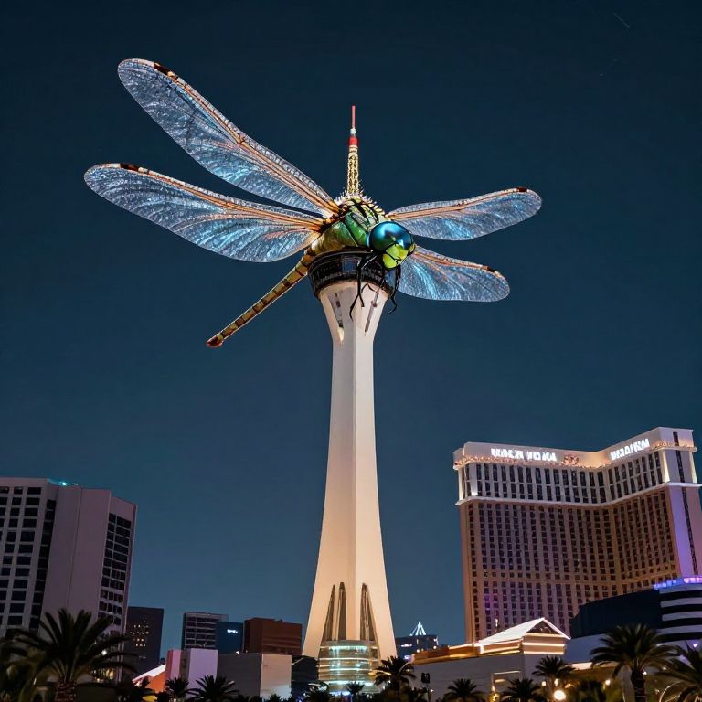 Closed Eye Visuals a gothic prehistoric dragonfly attacking the strat tower in las vegas in the future,