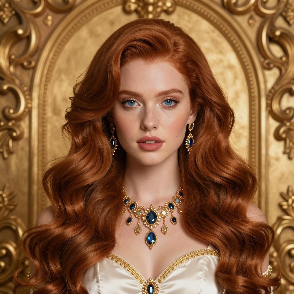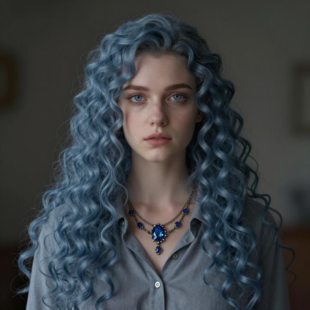 Portrait of Young Woman with Curly Red Hair and Teal Jewelry