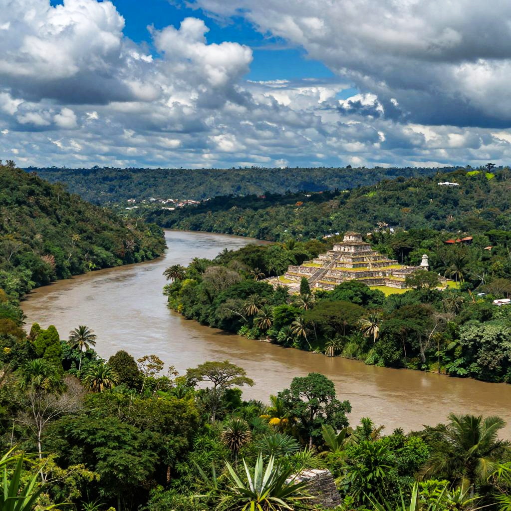 Latin America landscape with winding rivers and dense jungle, ancient ruins peeking through greenery, bright blue sky with dramatic clouds, ultra detailed, vivid colors