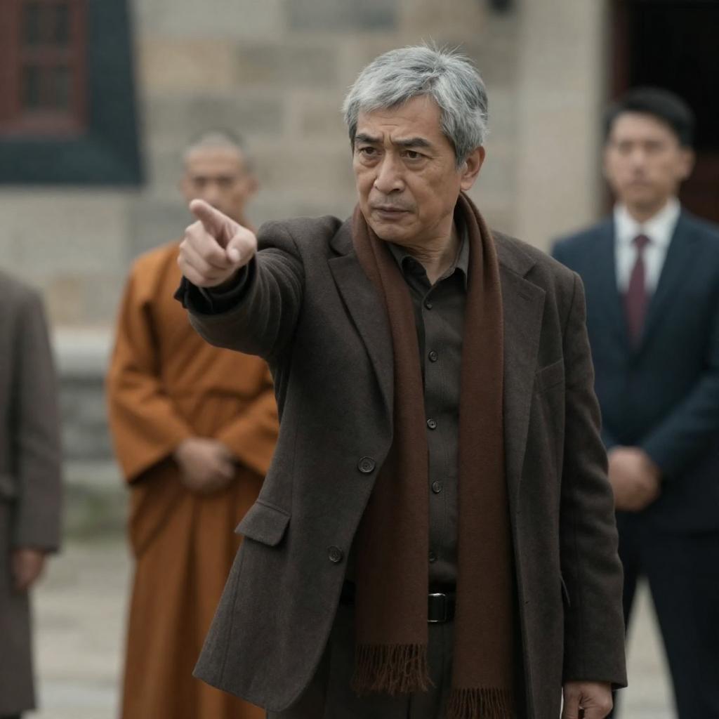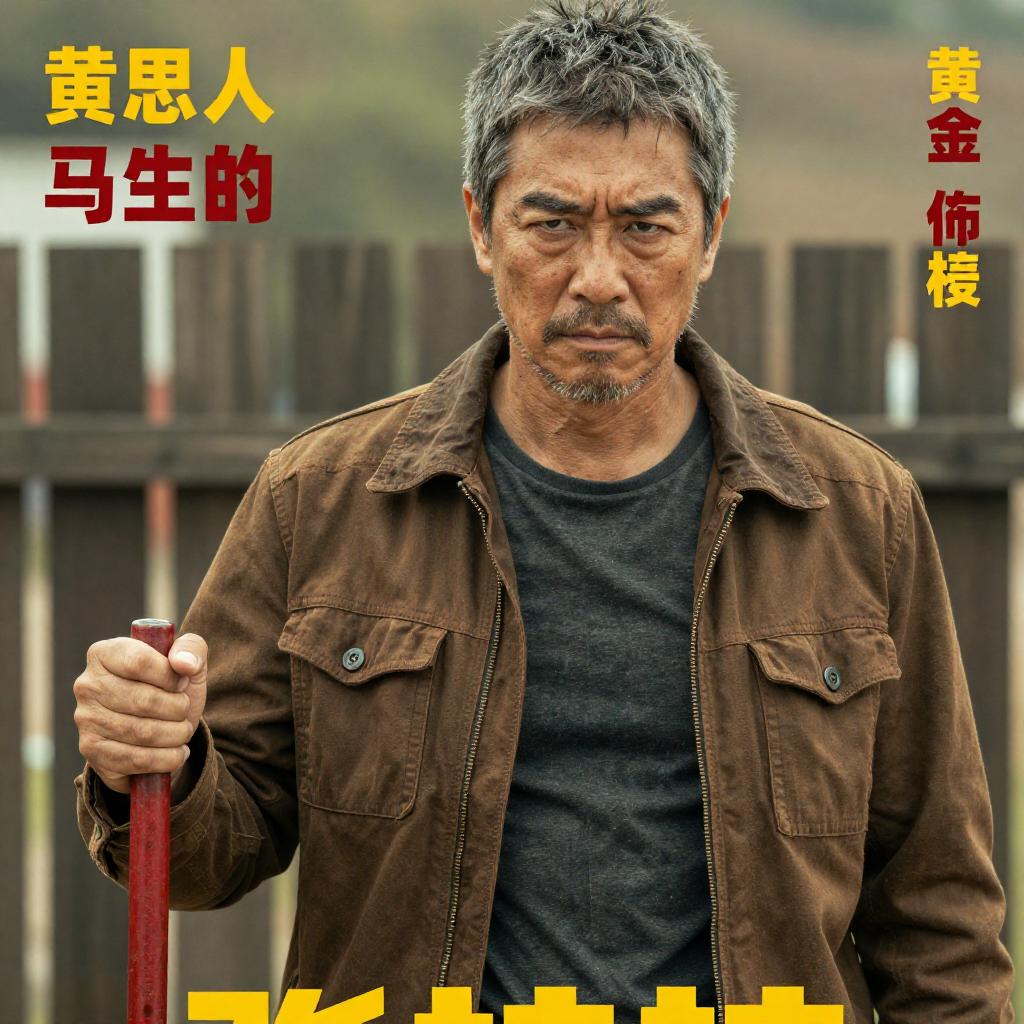 Photograph of a movie poster featuring a rugged, middle-aged man with short, graying hair, wearing a brown, ured jacket, and holding a red stick. He has a determined expression and is positioned in front of a wooden fence. The background is blurred, emphasizing the character. The poster includes yellow and red with actor names and film details.