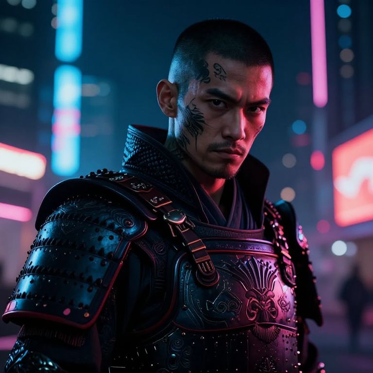 Sdxl resolution portrait of a cyberpunk samurai with intricate armor, glowing tattoos and neon city background at night, highly detailed face and textures, dynamic lighting with reflections and shadows