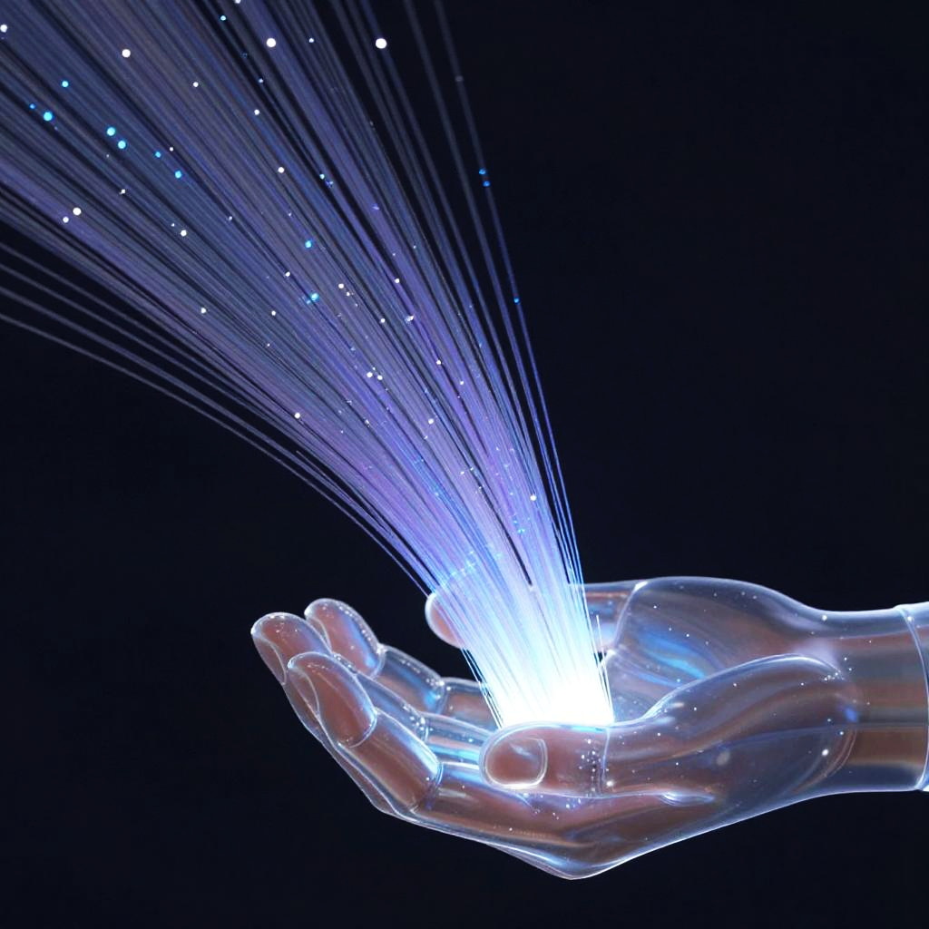 A surreal scene of glasfaser fibers transforming into digital streams of data flowing through a transparent hand holding them, glowing with soft blue and purple hues, concept art for cutting-edge telecommunications technology