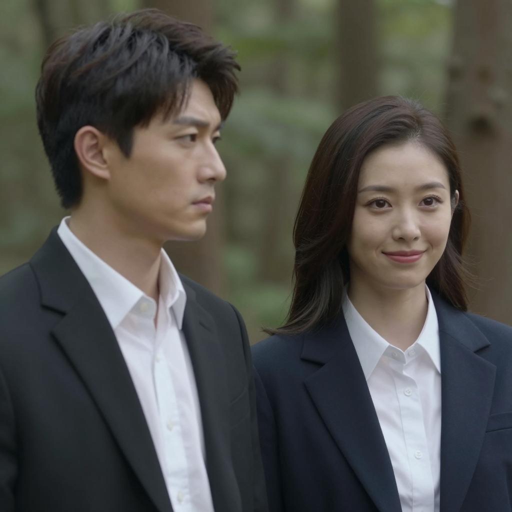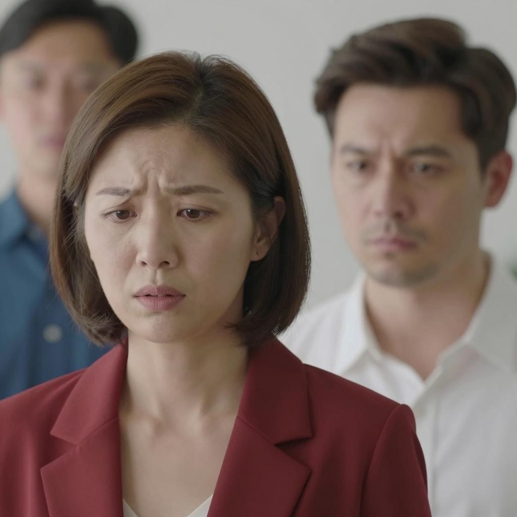 Two people in close-up. Woman with short brown hair, red jacket, and worried expression in foreground. Man with short brown hair, white shirt, and focused expression beside her. Blurred background with person in blue shirt.