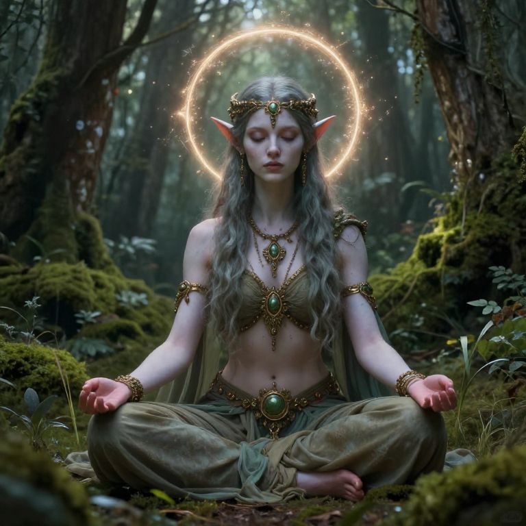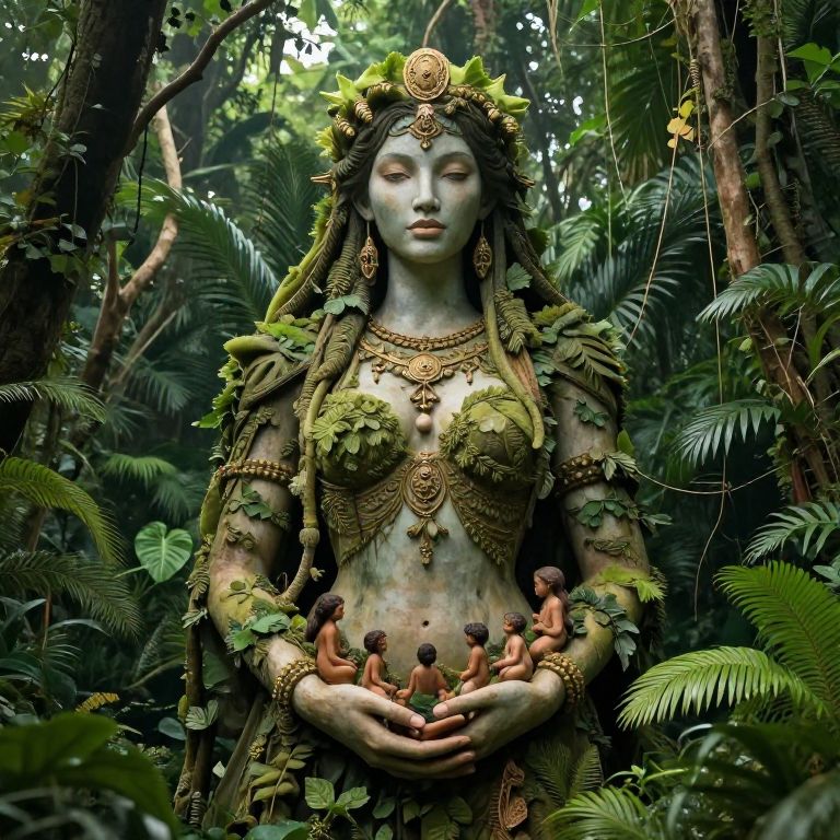 Giantessvore artwork representing a towering female figure amidst lush jungle, carefully cradling diminutive people, vibrant greenery, rich textures, mystical ambiance, soft diffused light, highly imaginative and visually intricate composition.