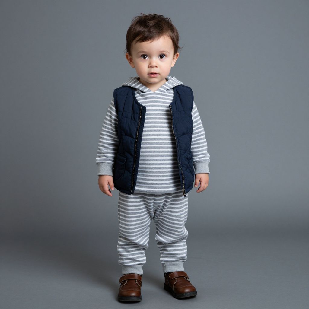 Toddler scoops ahoy steve, 1boy, male focus, solo, brown hair, striped clothes, striped shirt, full body, vest, hood, looking at viewer, brown footwear, standing, hoodie, grey background, pants, shirt