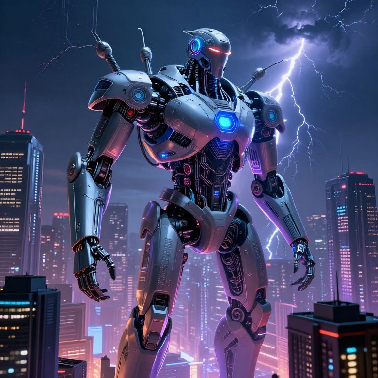 Computern depicted as a giant biomechanical entity in a digital cityscape, towering over skyscrapers made of circuit boards and LED lights, electric storms in the background, sci-fi atmosphere with rich detail and vivid neon colors.