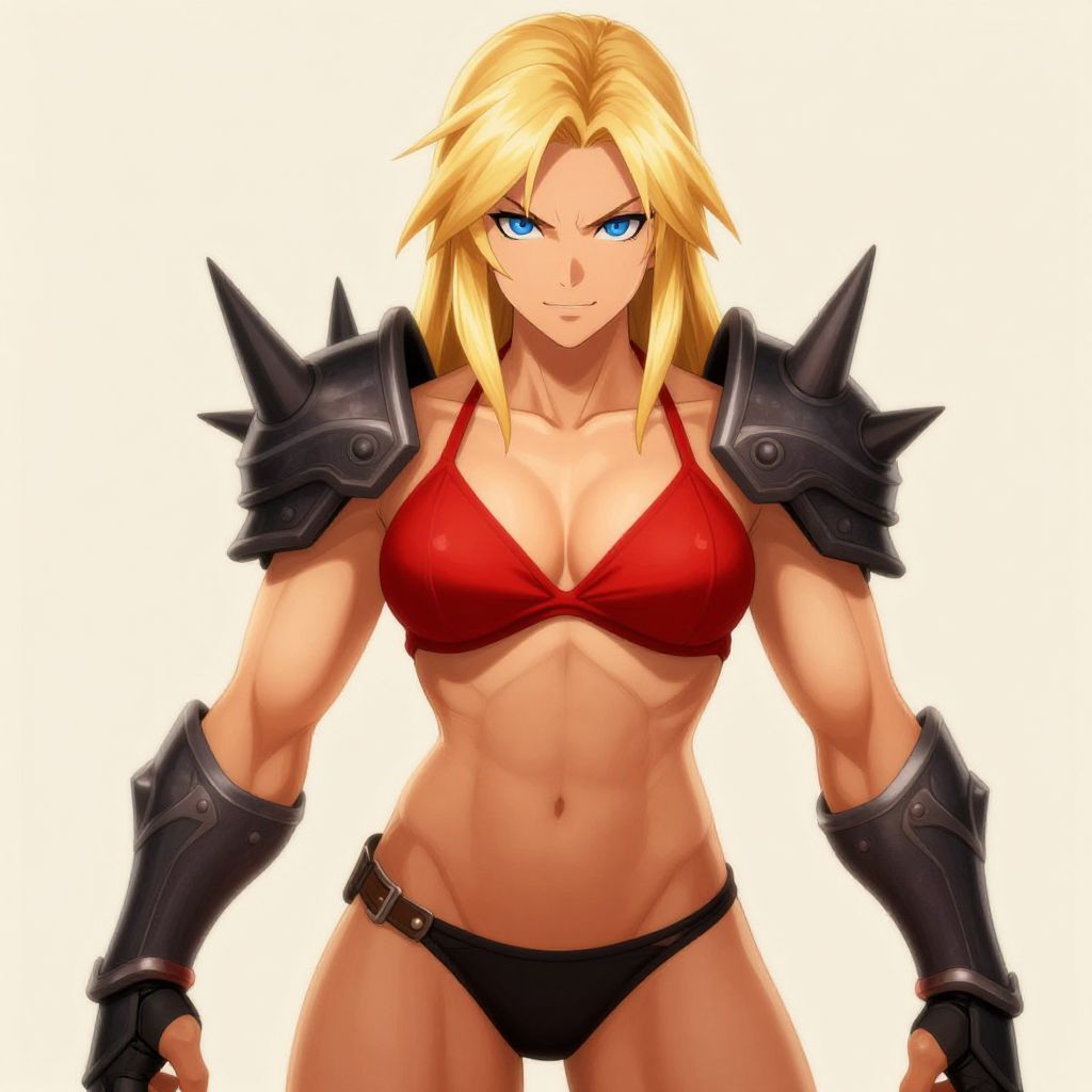 Illustration of a muscular blonde anime woman warrior with blue eyes wearing a red bikini top and black bottoms. She is adorned with dark, spiked shoulder and arm armor and has an intense, determined expression. The character showcases defined abs and a strong physique, with a beige background.