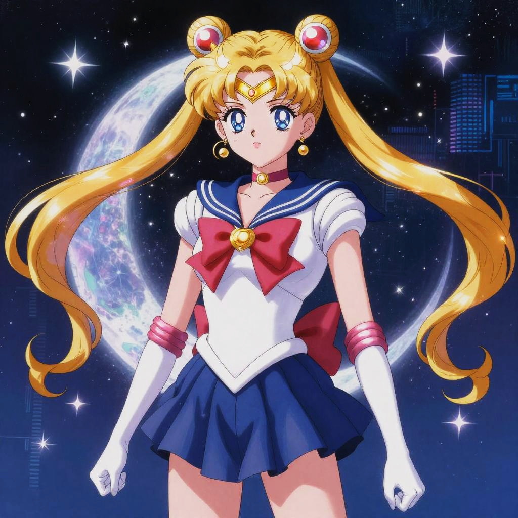 Sailor Moon AI depicted as a futuristic female warrior with glowing neon accents and ethereal moon-themed armor, standing against a cosmic backdrop filled with stars and digital light patterns, vivid and detailed artistry