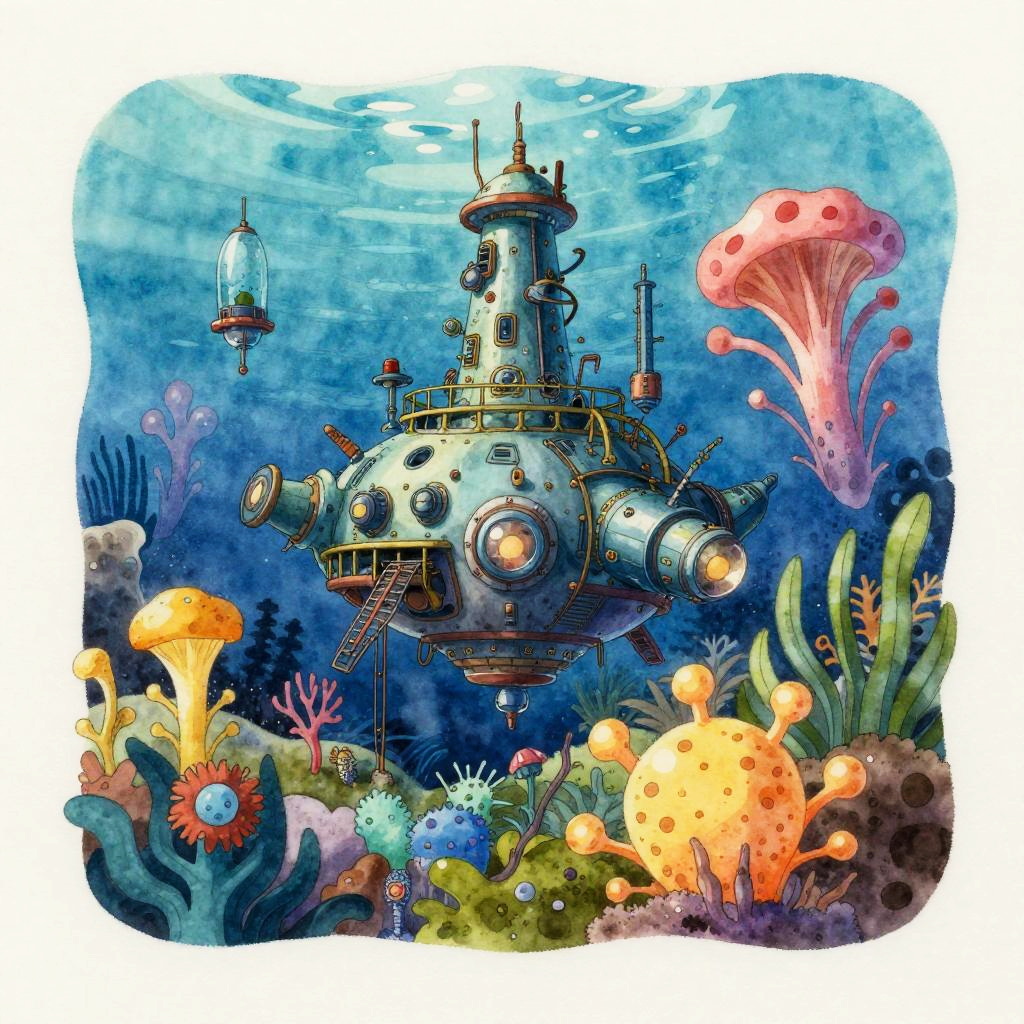 Hand-drawn watercolor illustration of a futuristic underwater research station surrounded by vibrant, bioluminescent sea flora. The surreal scene showcases a detailed metallic submersible structure hovering above the ocean floor, featuring various antennas and observation windows, inspired by the artistic style of Hayao Miyazaki.