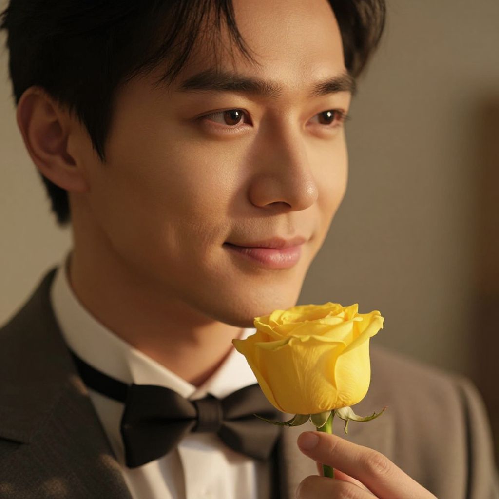 Photograph of an Asian man with fair skin and black, slightly messy hair, wearing a black suit with a white dress shirt and black bow tie. He holds a vibrant yellow rose close to his face with his right hand, gently touching the petals. His expression is soft and contemplative, with a slight smile. The background is blurred, featuring neutral tones, which keeps the focus on the man and the rose. The lighting is warm, highlighting the rose's yellow color and the man's smooth complexion. The image has a soft, slightly vintage feel.