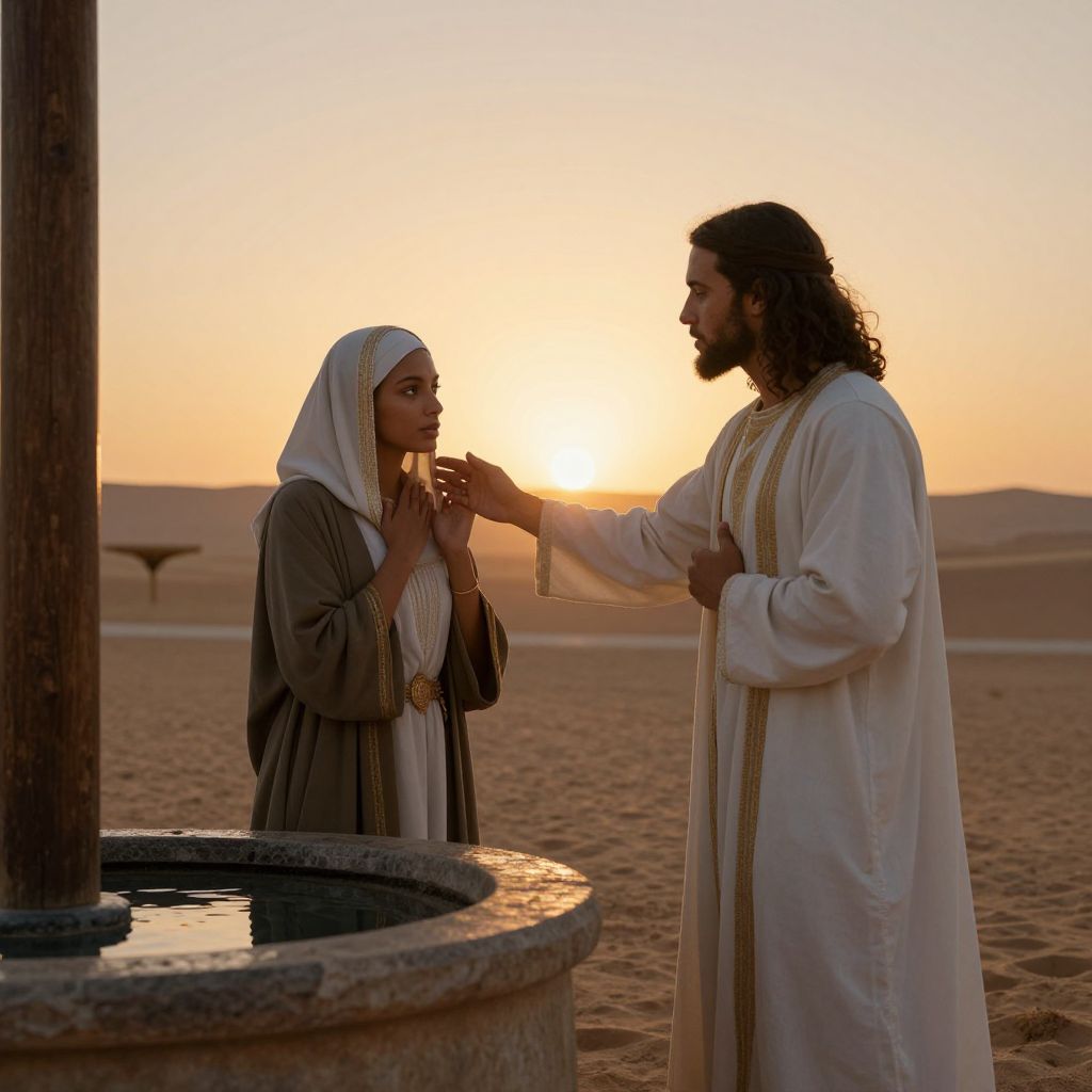 In the golden glow of twilight, a profound encounter unfolds by the well, where the Samaritan woman finds herself in a moment of unexpected connection, her heart stirred by the gentle yet transformative presence of Jesus, as the whispers of hope and redemption ripple through the stillness of the desert air.