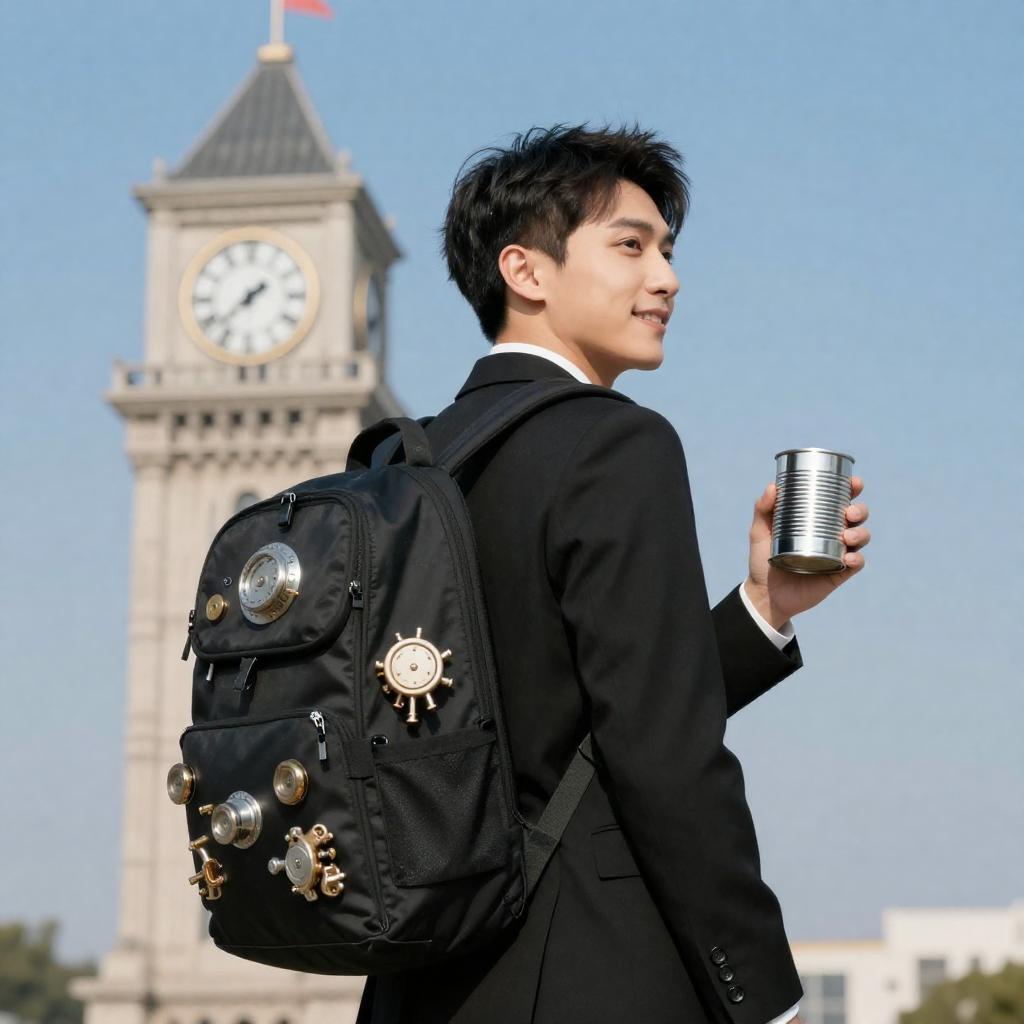 Man in a black suit with a backpack full of mechanical gadgets, smiling, holding a metal canister, standing in front of a clock tower, blue sky background. Clock tower with a small flag on top. Man's hair is short and dark.