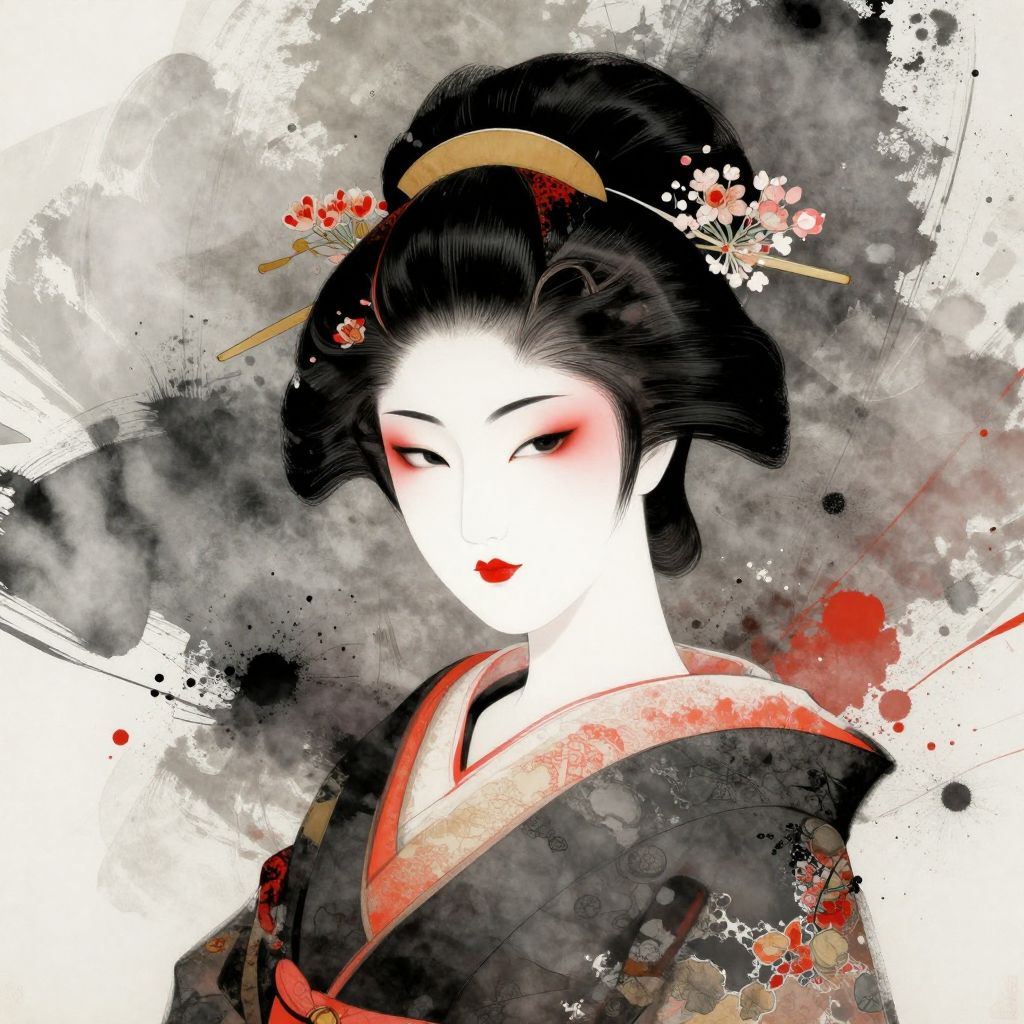 The image is a striking illustration of a geisha, rendered in a highly stylized and artistic manner. The geisha's face is adorned with intricate makeup, featuring bold red accents around the eyes and a delicate floral arrangement in her hair. Her hair is styled in an elegant updo, with a single flower accentuating the side. The geisha is wearing a traditional kimono, which is partially visible, adding to the sense of elegance and cultural authenticity. The background is a blend of abstract splashes and splatters in shades of gray, black, and red, creating a dynamic and somewhat chaotic effect that contrasts with the geisha's serene and composed expression. The overall composition is balanced, with the geisha centrally positioned, and the abstract elements framing her face and body, drawing the viewer's attention to her as the focal point of the image.
