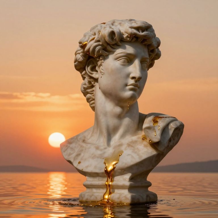 Photograph of a white marble bust of a classical Greek or Roman male figure with curly hair, serene expression, and slightly muscular neck. The statue is partially submerged in a calm, reflective body of water, with golden liquid dripping down its left shoulder and chest. The background features a vibrant, orange-pink sunset with the sun near the horizon, casting a warm glow on the water and statue. The sky is clear with soft gradients of orange and pink hues. The water's surface reflects the sunset and statue, creating a harmonious blend of natural and artistic elements.