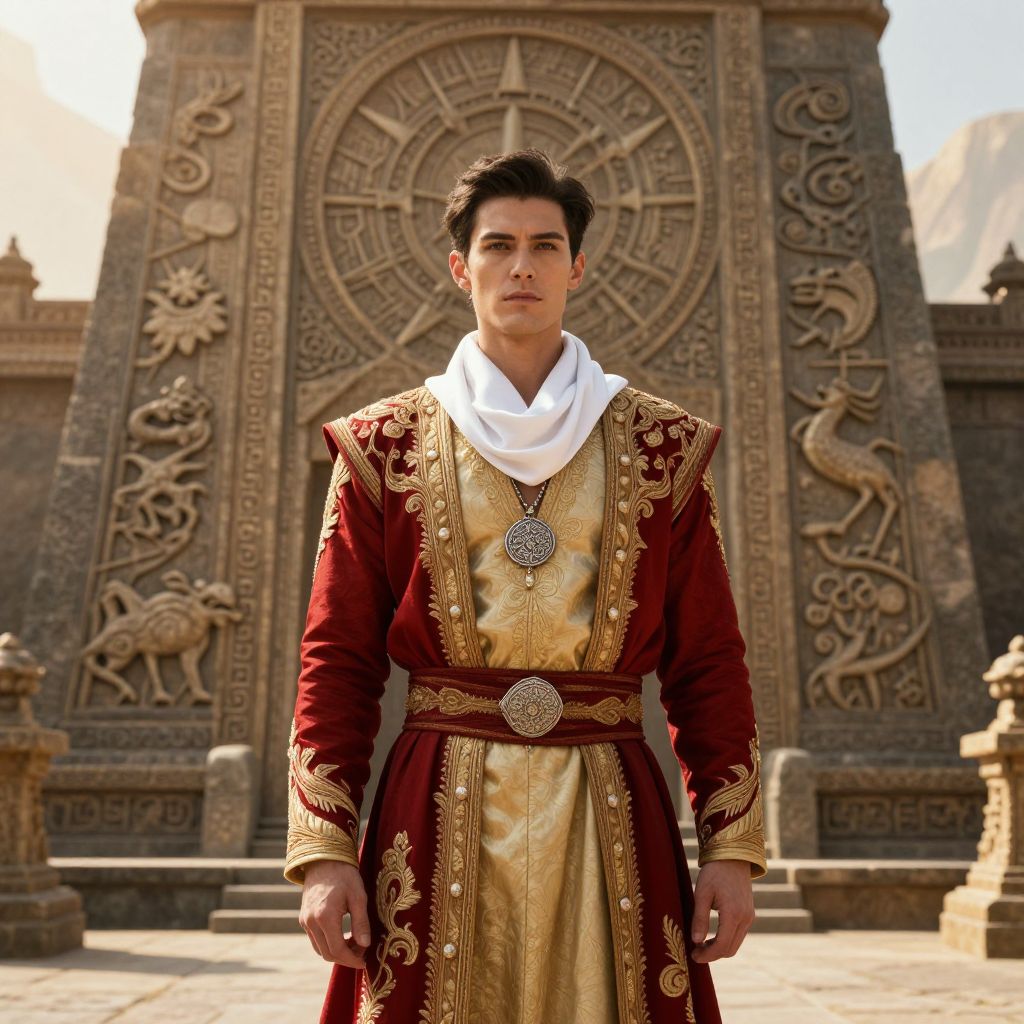 A tall, lean man with sharp facial features and a calm, focused expression wears a red and gold traditional outfit with intricate embroidery, a white silk scarf wrapped neatly around his neck, and a silver pendant hanging from his chest. He stands confidently in front of a massive stone wall adorned with intricate, ancient carvings depicting mythical creatures and celestial patterns. The scene is set in a mystical, sun-drenched landscape with soft golden light filtering through the air, giving it a timeless and epic atmosphere.