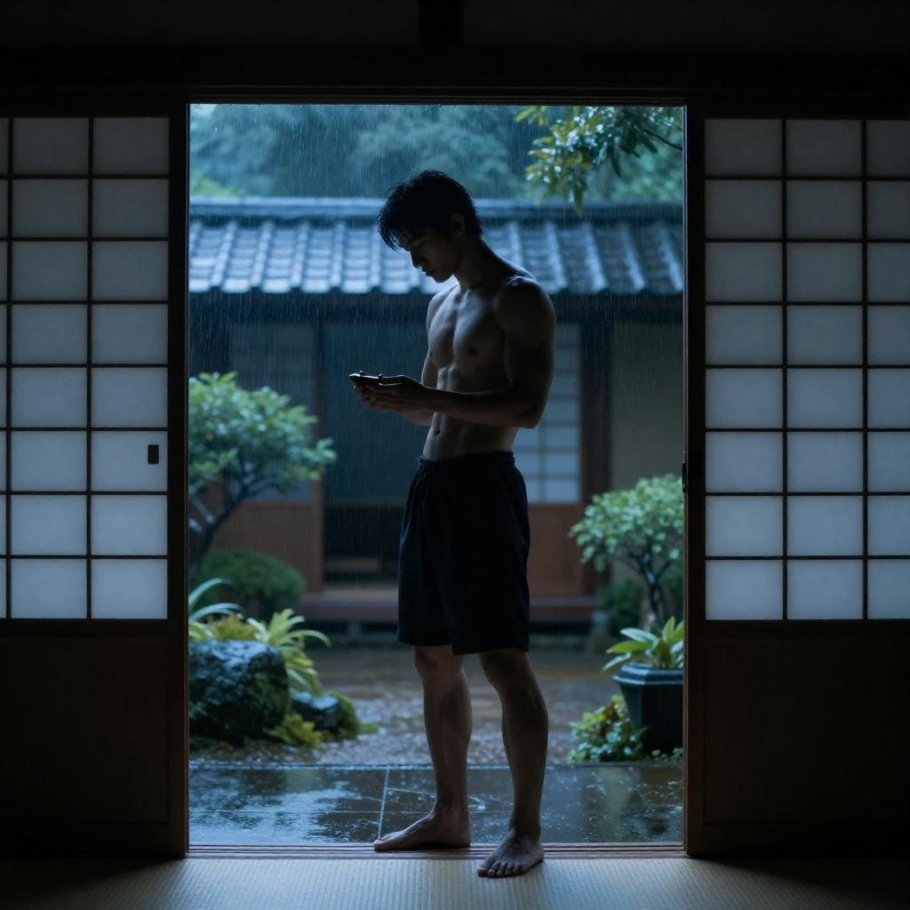 Silhouetted shirtless muscular man standing barefoot in a doorway of a traditional Japanese room with shoji screens on each side. He is focused on an object in his hands, possibly a phone, while rain falls outside illuminating the scene with a blue light. The open door reveals a garden with green plants and a tiled roof in the background, creating a calm and contemplative nighttime atmosphere.