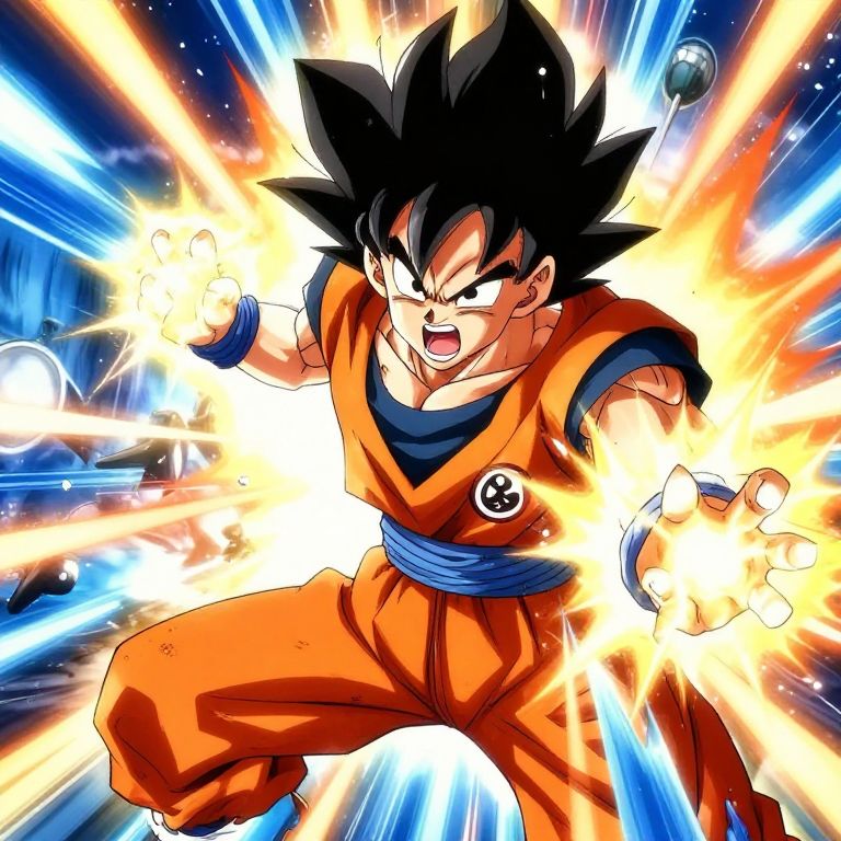 This is a digital illustration in a vibrant, anime style depicting Goku, a character from the "Dragon Ball" series. He is mid-action, with his black, spiky hair flying and intense, determined expression. Goku is wearing his iconic orange martial arts gi with blue straps and an "K" emblem on his chest. His fists are glowing with bright yellow energy beams, radiating outward. The background is a dynamic burst of blue and white energy lines, creating a sense of speed and power. The image is highly detailed with bold colors and strong contrasts, emphasizing Goku's powerful stance and energetic aura.