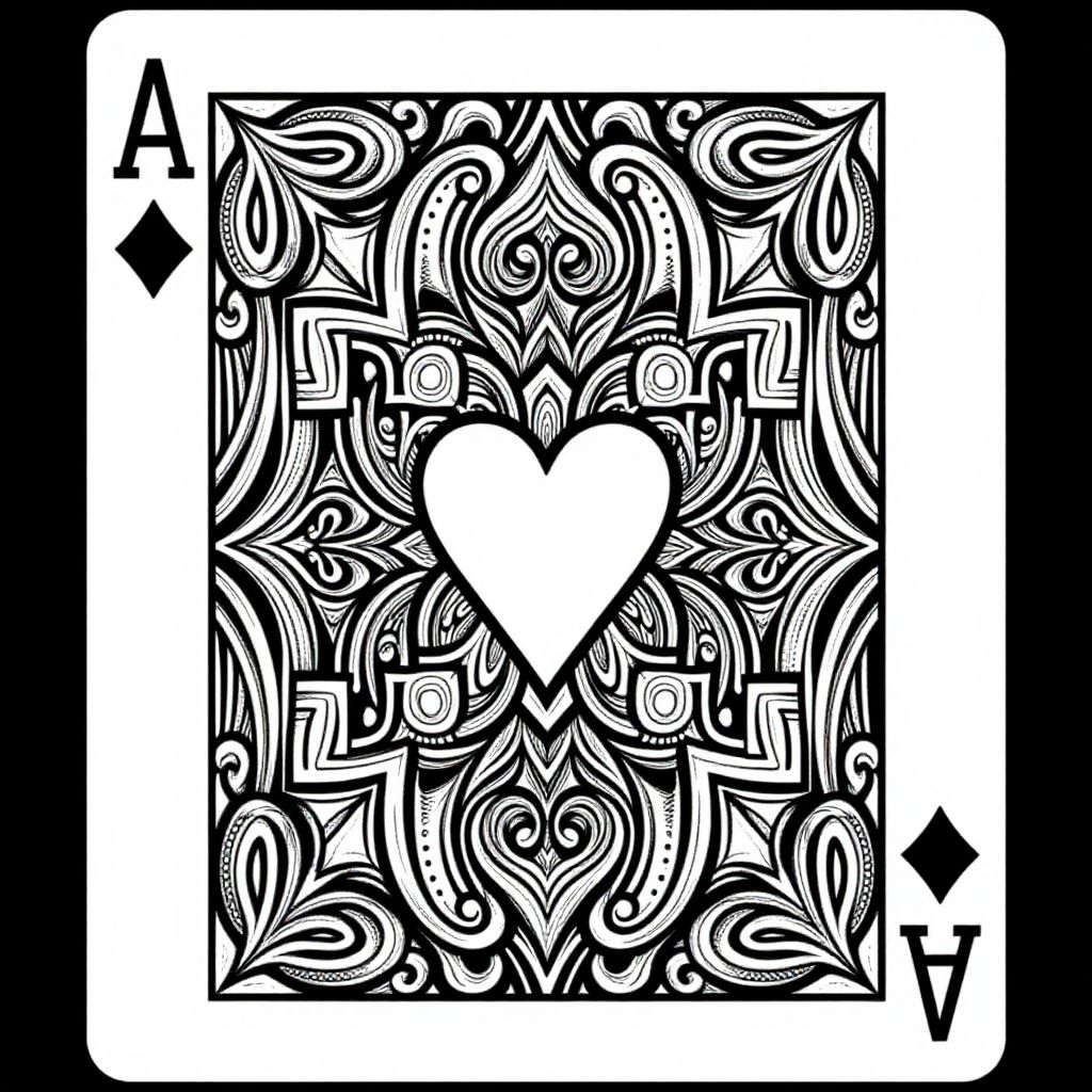 The image is a highly detailed, black-and-white illustration of a poker card, specifically the Ace of Diamonds. The card is depicted in an intricate, psychedelic style with elaborate, swirling patterns and ornate designs. The Ace is rendered in a symmetrical, almost mandala-like arrangement, with a central heart shape surrounded by a series of interlocking, swirling lines and shapes. The use of thick black lines creates a striking contrast against the white background, emphasizing the intricate details and the card's symmetrical design. The overall composition is balanced and harmonious, with the Ace occupying the entire screen, making it the sole focus of the image. The card's design is both elegant and complex, with a sense of movement and depth created by the interplay of the swirling patterns.