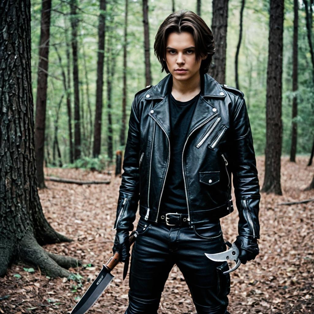 Shirtless man with wet, dark hair stands in a tiled shower, holding sharp, black claws on his right hand. Blood stains his chest and shoulder. White tiles and shower curtain in the background. Man's face shows a focused expression.