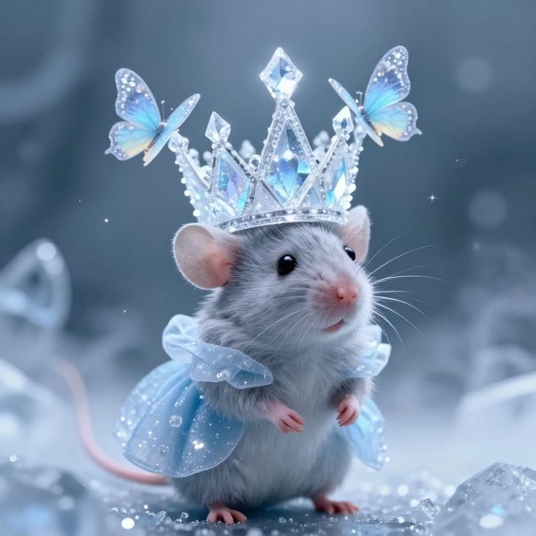 Photograph of a small, gray mouse with pink ears and nose, wearing a sparkling, crystal crown adorned with glowing blue butterflies. The mouse also has a translucent, blue, ruffled cape with sparkling details. The background is a soft, blurred blue with light bokeh effects, creating a magical, ethereal atmosphere. The mouse stands on a glowing, icy surface, enhancing the fantasy theme. The image is highly detailed, with a focus on the mouse's delicate features and the shimmering textures of the crown and cape.