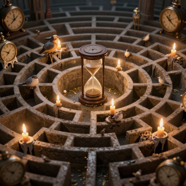 In a surreal labyrinth of time, where clocks melt into each other under the glow of flickering candles, tiny birds nest within hourglasses, their delicate chirps echoing the whispers of forgotten moments and the eternal dance between memory and oblivion.